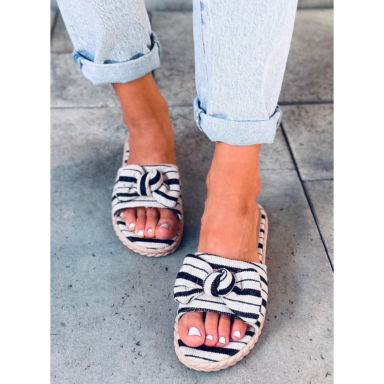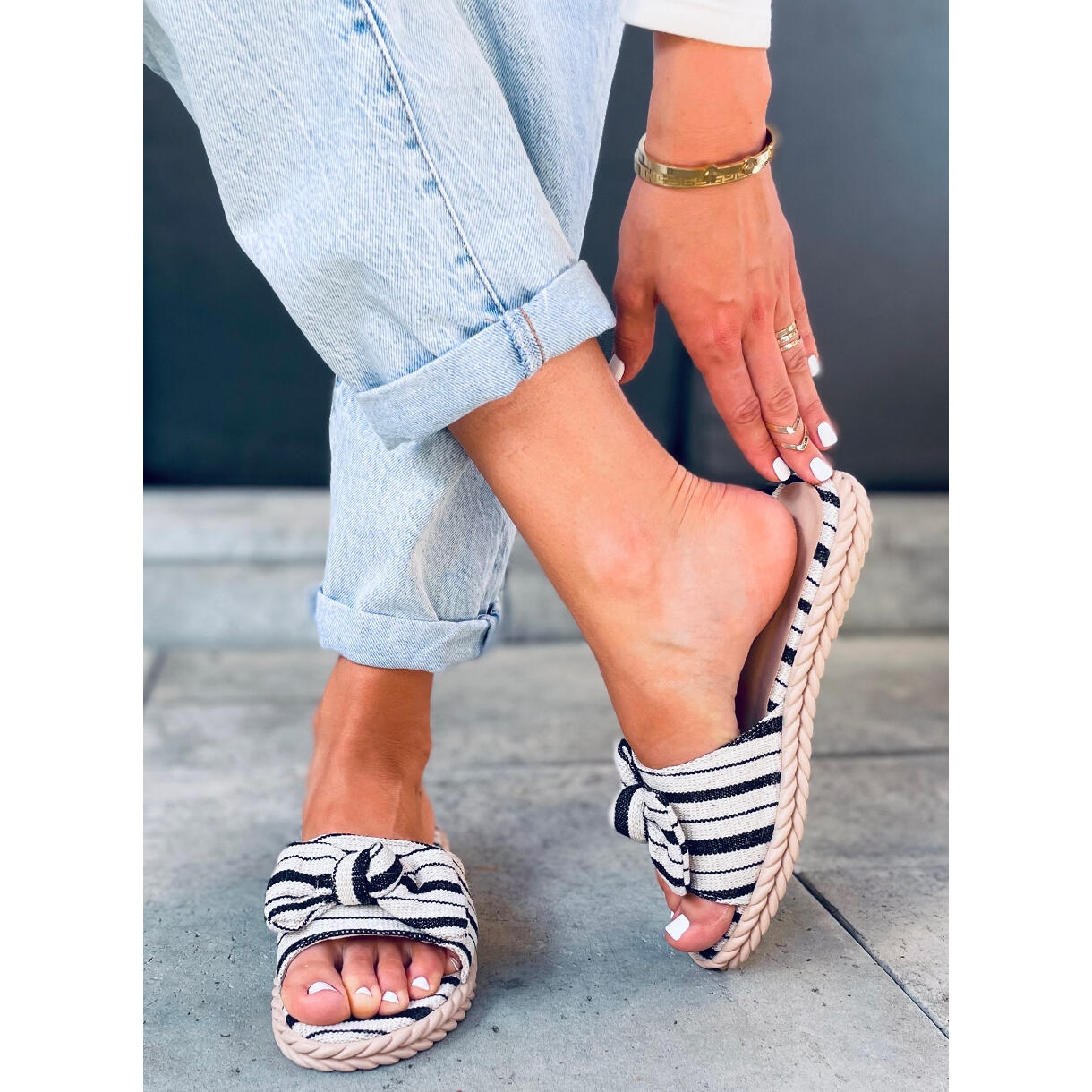 Představujeme dámské pantofle Adana Black, které skvěle doplní váš letní šatník. Tyto stylové žabky s plochou podrážkou se vyznačují krásnou mašlí vpředu a letním pruhovaným vzorem, díky kterému přitahují pozornost a dodávají kouzlo každému stylingu.