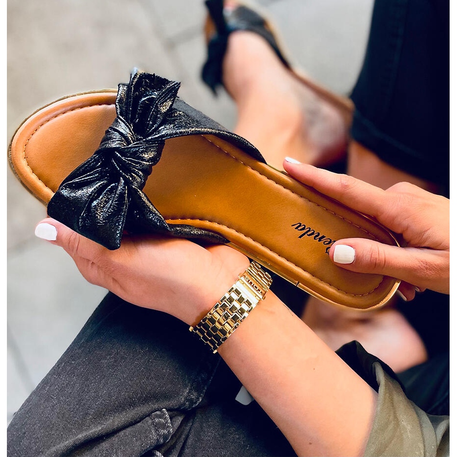 Žabky se vyznačují metalickou úpravou, která krásně zvýrazní sváteční opálení a přitáhne pozornost. Okouzlující mašlička jim dodává dívčí charakter, díky čemuž jsou perfektním doplňkem každého letního šatníku. Díky ploché podrážce poskytují tyto žabky pohodlí po celý den a každý krok se stává potěšením.