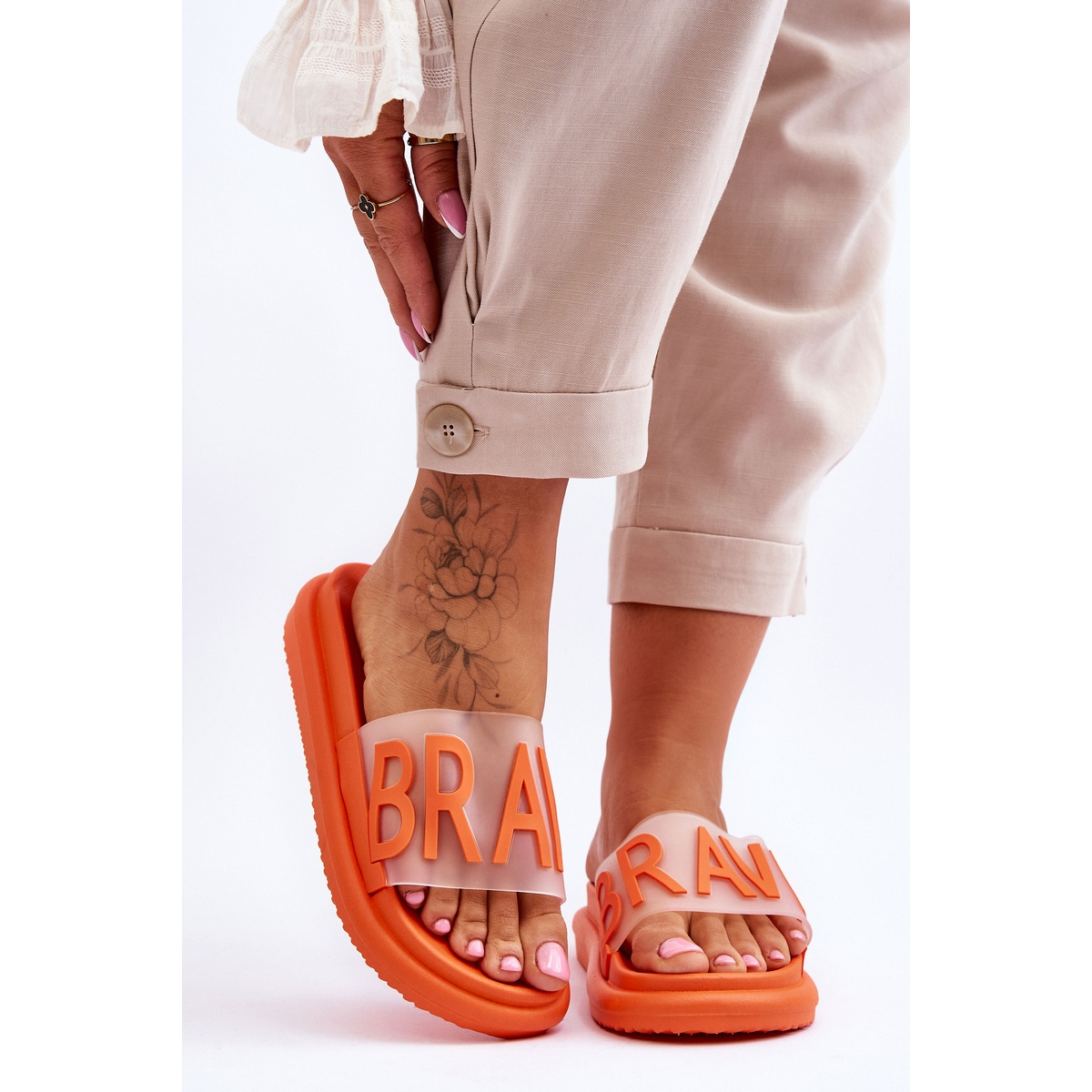 Moderní a pohodlné vinceza Brave Flip Flip Flip Flip Flip jsou návrhem pro ženy, které si cení módního vzhledu a pohodlí nošení. Vyrobeno z gumového plastu, umístěné na stabilní 4 cm platformě, jsou skvělé každý den - na procházku, na pláž nebo na městské stylizace. Transparentní akcenty jim dávají lehkost a intenzivní oranžová barva (#FFD523) upouští oko.