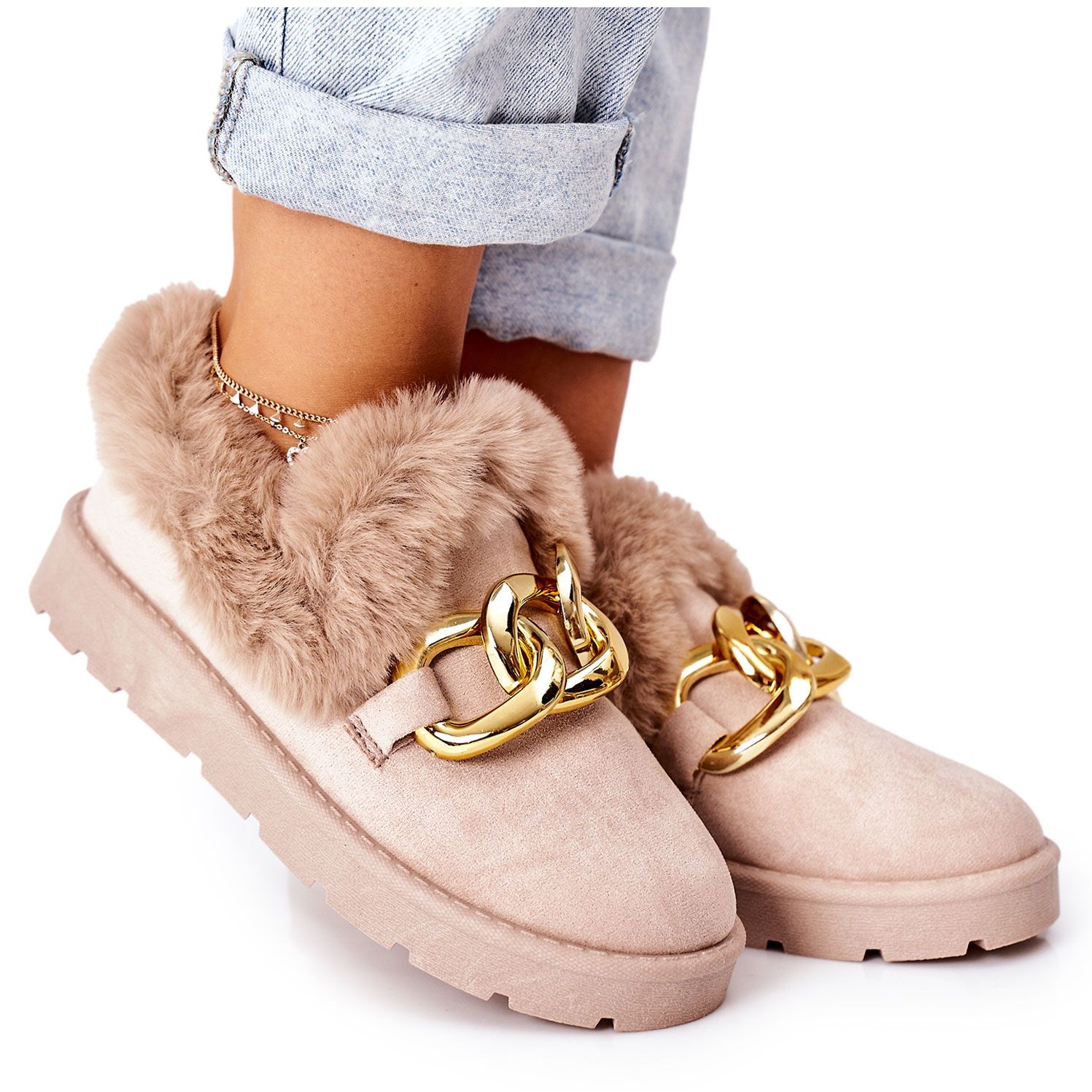Pantofle jsou pečlivě vyrobeny z na dotek příjemné syntetické kožešiny, která zajišťuje nejen optimální pohodlí, ale také teplo v chladných dnech. Další výhodou je poutavý zlatý řetízek, který jim dodává elegantní a moderní charakter. Díky tomu se doplněk stává dokonalým doplňkem jak každodenních, tak i sofistikovanějších stylů.