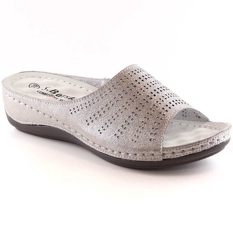 Pohodlné dámské kožené pantofle na klínku v růžovém zlatě S.Barski BN292 jsou ideální nabídkou pro ženy, které oceňují eleganci spojenou s pohodlím. Poskytují pohodlnou oporu chodidlu díky přírodní kůži použité k vytvoření podšívky a stélky, což je jedna z hlavních předností nabízeného produktu renomovaného výrobce - S.Barski.