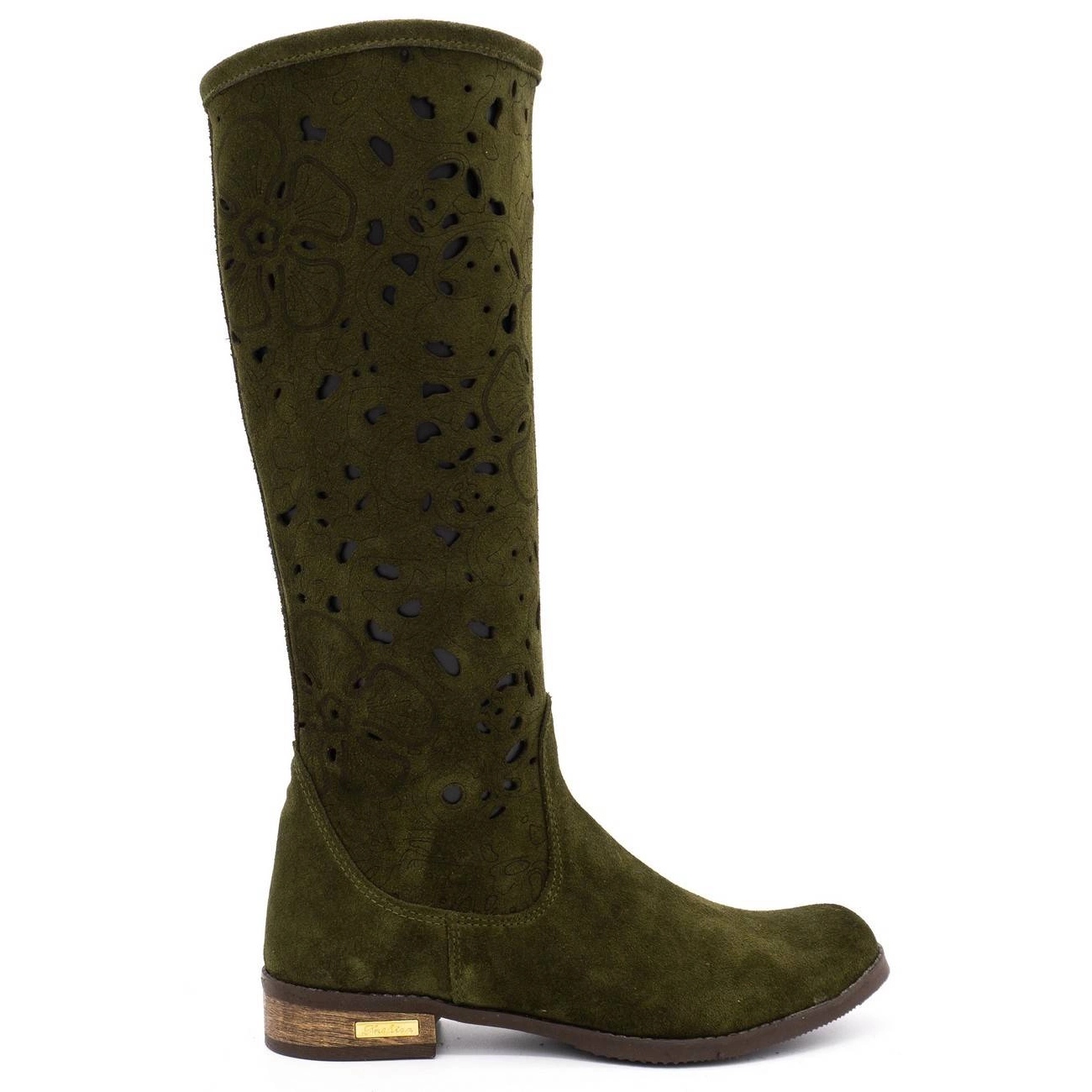 Elegantní a pohodlné ženské boty Olivier vyrobené z přírodní kůže (Nubuk) - měkké, příjemné k dotyku a snadno se přizpůsobí noze. Otevřený, geometrický florální vzorec na horní části jim dává čerstvý, jaro konzumující charakter a univerzální délka kolena způsobuje, že se shodují s mnoha styly.