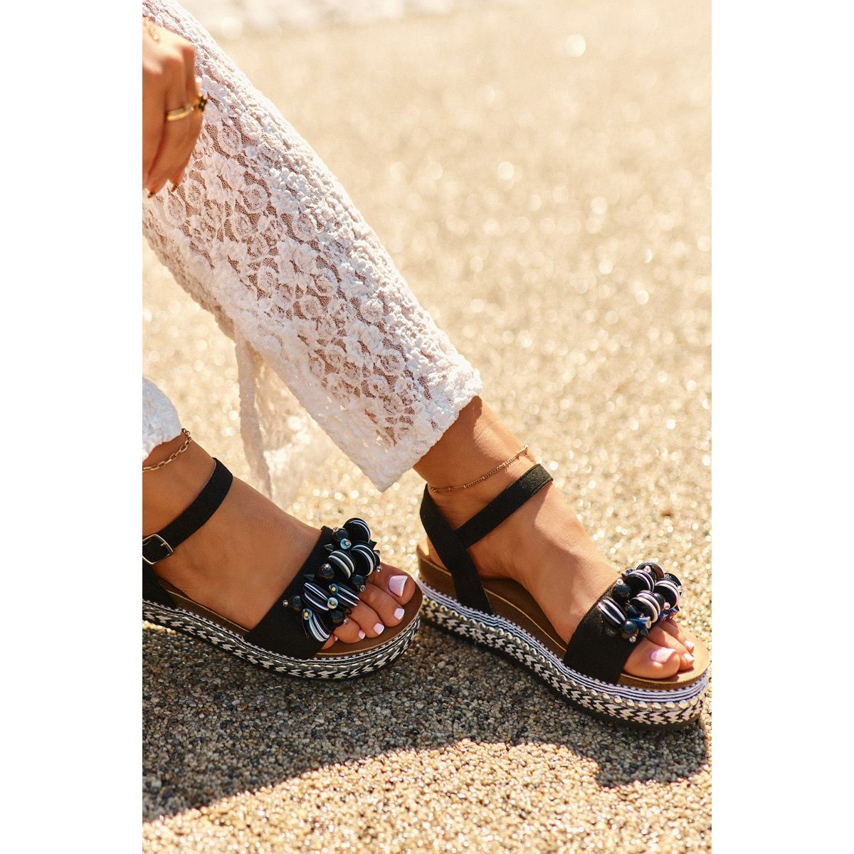 Sandály, které jsou umístěny na velkolepé, zdobené plošině s výškou 3,5 cm a jemný klín, poskytují během každého kroku vynikající stabilitu a pohodlí. Nastavitelný popruh s sponou vám umožňuje dokonale odpovídat každé noze, což je činí nejen módní, ale také funkční. Kromě toho jim dekorativní detaily na přední liště dávají jedinečný charakter, který jistě přitahuje pozornost.