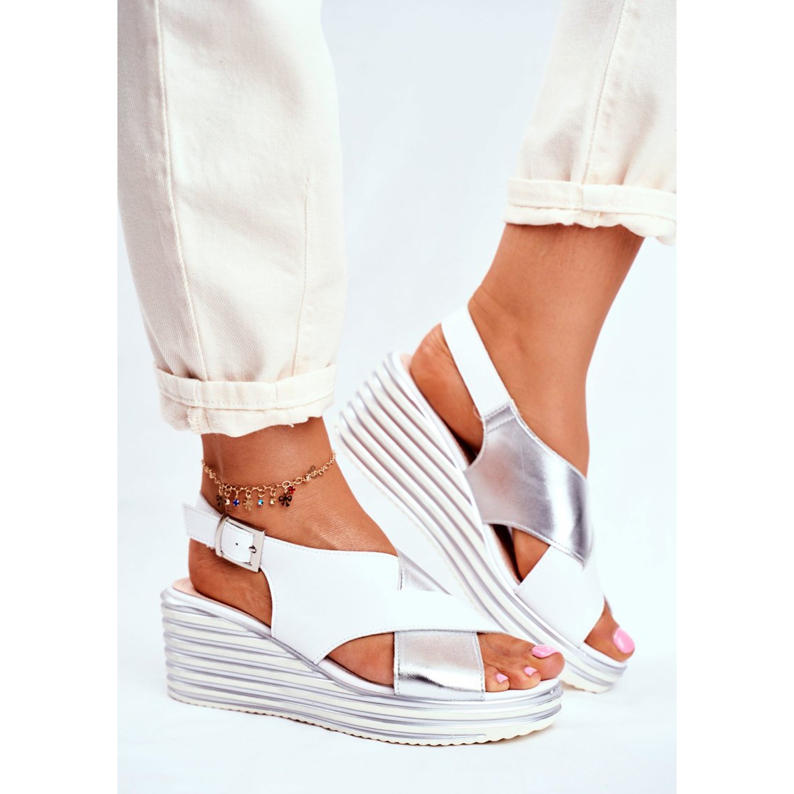 Díky měkké, profilované stélce z přírodní kůže bude každý okamžik strávený v těchto sandálech potěšením. Jemně profilovaný klín vysoký 6,5 cm a platforma 2,5 cm dokonale zvednou postavu, zdůrazní ženský tvar a zároveň zajistí stabilitu a pohodlí na každém kroku.