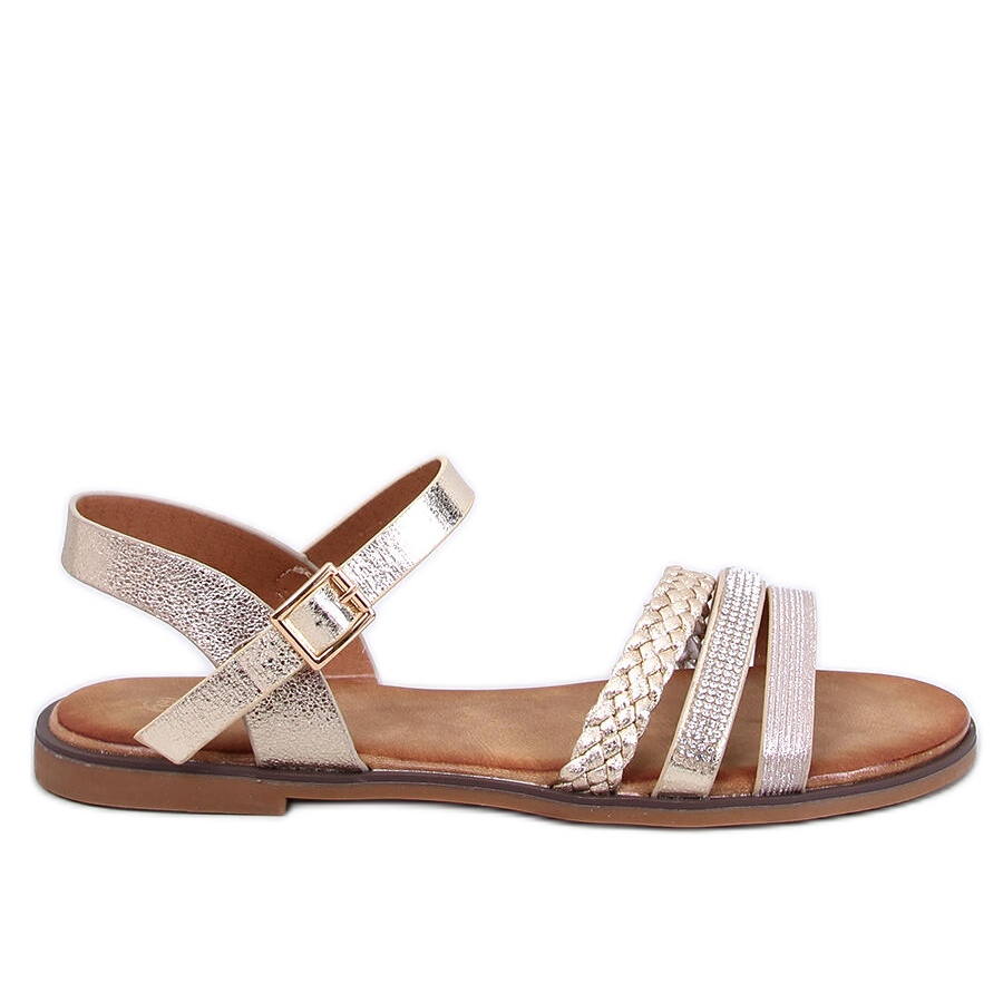 Objevte letní eleganci s dámskými sandály Pasini Gold! Tyto kovové ploché sandály jsou nutností pro jakýkoli letní styling. Vyznačují se nejen jedinečnou zlatavou barvou, ale také lesklou aplikací drobných kamínků, které se na slunci jemně třpytí. Jejich klasický střih dokonale zvýrazní vaše nohy, a to díky nastavitelné sponě, která zvýrazňuje kotník.