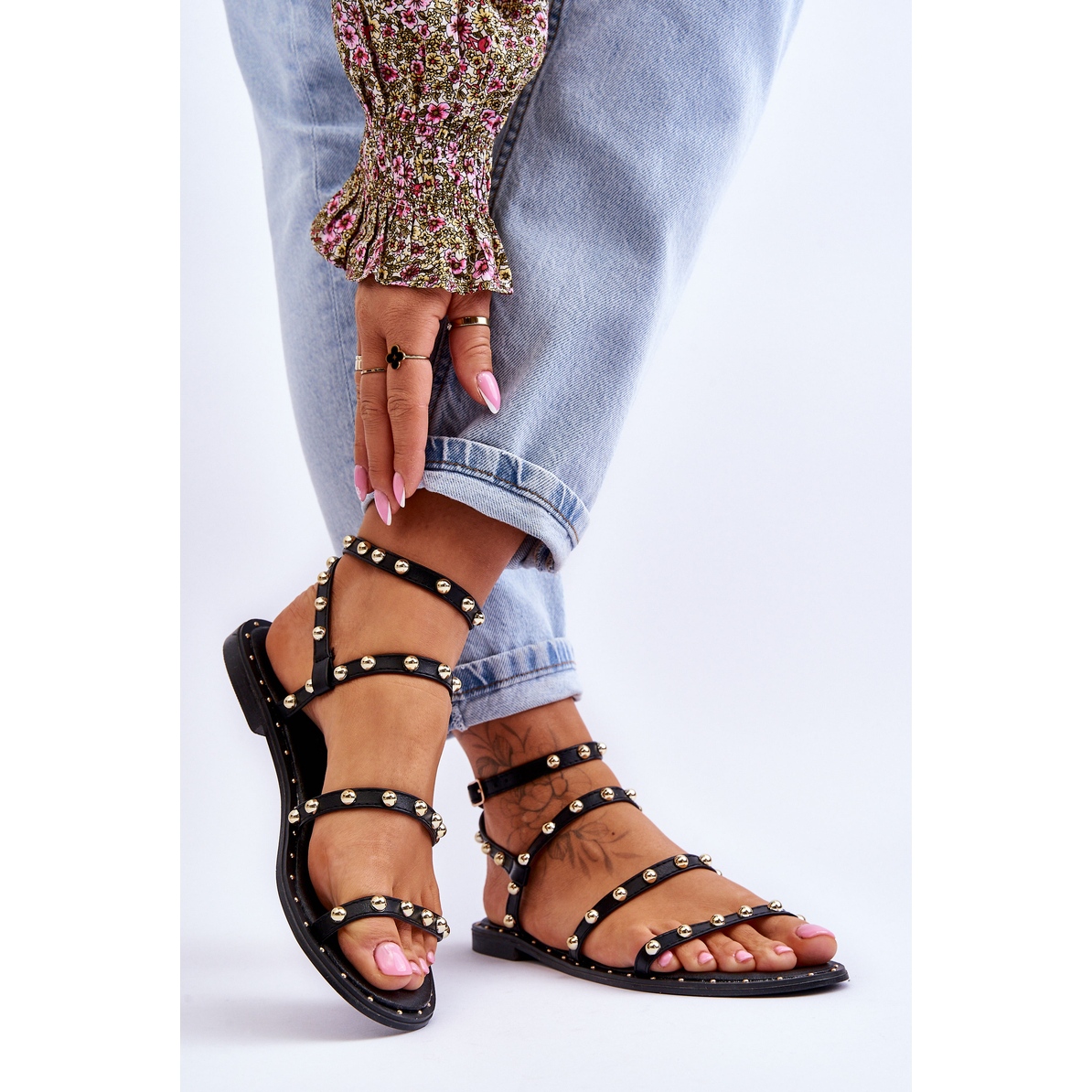 Pohodlí nošení zajišťuje promyšlený design - sandály se zapínají kolem kotníku nastavitelným páskem s přezkou, který umožňuje dokonalé přizpůsobení obuvi k noze. Špička je otevřená a zaoblená, což je ideální pro horké dny a nabízí nohám potřebnou ventilaci. Pro dodatečný půvab použil výrobce dekorativní ozdoby kolem ploché podrážky, která je vyrobena z pryže s protiskluzovým profilem, zaručujícím stabilitu na jakémkoli povrchu.