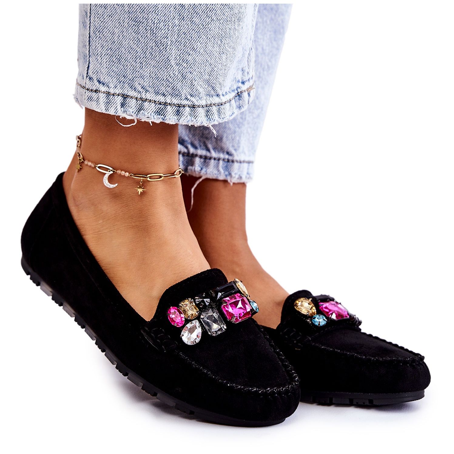 Stylové a pohodlné – takové jsou Dámské semišové mokasíny s ozdobami Janetta v černé barvě. Tyto mokasíny vyrobené z vysoce kvalitního ekologického semiše poskytují nejen pohodlí při nošení, ale také elegantní vzhled. Ozdobné kameny na přední straně jim dodávají jedinečné kouzlo, díky čemuž jsou ideální pro mnoho různých stylů.