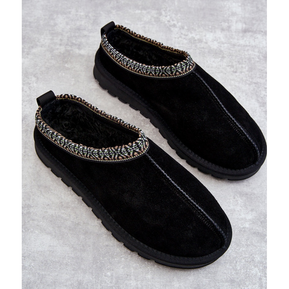 Teplé, stylové a velmi pohodlné - ideální pro chladné dny strávené doma. Vyrobeno z přirozené semišové kůže, izolované měkkou, silnou srstí, namontovanou na masivní plošině s podrážkou bez sklipu. Klasické černé barvy a jemné dekorace na horní části způsobují, že papíry vypadají elegantně a zároveň poskytují pohodlí po celý den.