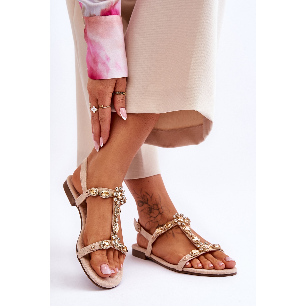 FI1 Calabrio jsou sandály vyrobené z vysoce kvalitního ekologického semiše s důrazem na každý detail. Elegantní, béžové proužky jsou zdobeny lesklými kamínky a kamínky, které dodávají botám jedinečný lesk a charakter. Každý krok, který v těchto sandálech uděláte, bude odrážet vaši osobnost a vytříbený vkus.