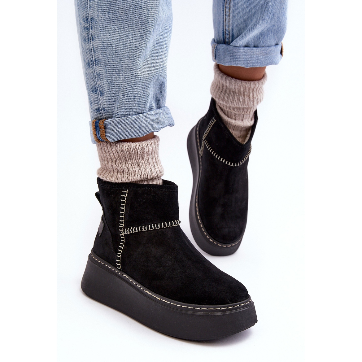 Elegantní a teplé sněhové boty Maciejka, vytvořené pro mrazivé dny. Vyrobeno z vysoce kvalitní přírodní semišové kůže, izolované měkkou kabátem ovčí kůže - poskytují pohodlí a tepelnou izolaci. Nasazeno na masivní, gumovou plošinu s výškou 6,5 cm, se vyztuženou patou pro lepší stabilizaci nohy. Klasický, skluz -in řez bude fungovat v každodenních zimních stylizacích.