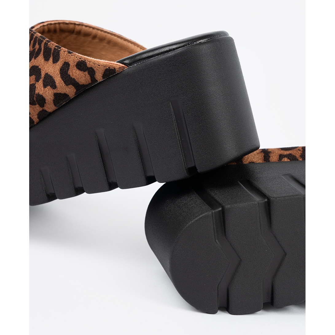 Žačky mají otevřené upevnění a posuvnou sponu, díky kterému jsou nasazeny a sundávají se extrémně jednoduché a pohodlné. Dokonale profilovaná vložka ekologické kůže zajišťuje pohodlí i při delších procházkách a vysoká lavička 6,5 cm přidává ke každému kroku ženskost a eleganci. Stylový leopardský vzor způsobuje, že flip -flops dokonale odpovídá různým oblečením - letních šatů i příležitostných džínách.