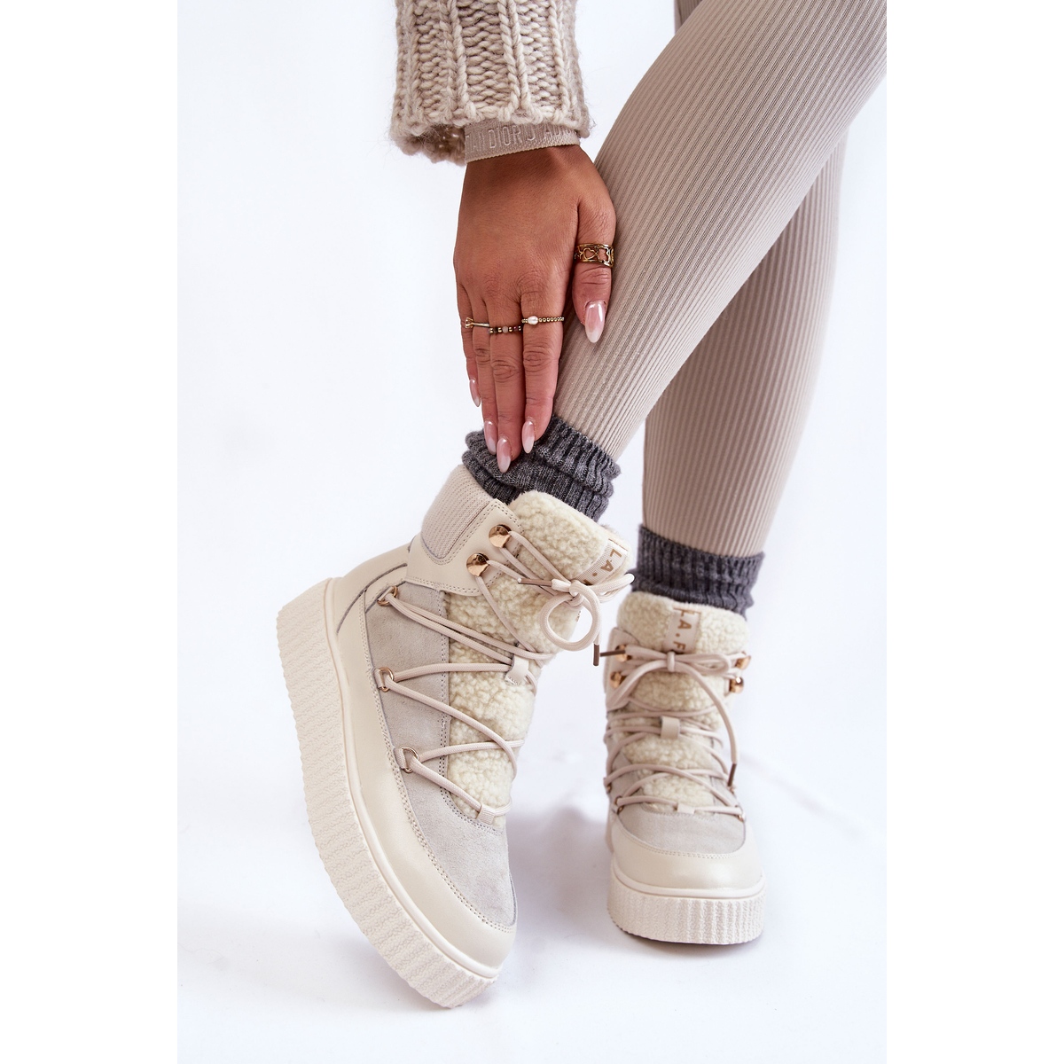 Tyto stylové kotníkové boty byly navrženy tak, aby spojovaly funkčnost a módní vzhled. Tyto sněhule vyrobené z kombinace přírodního semiše a vysoce kvalitní ekologické kůže poskytují odolnost a zároveň dbají na estetickou stránku. Díky neutrální světle béžové barvě se obuv perfektně hodí k většině zimních stylů.