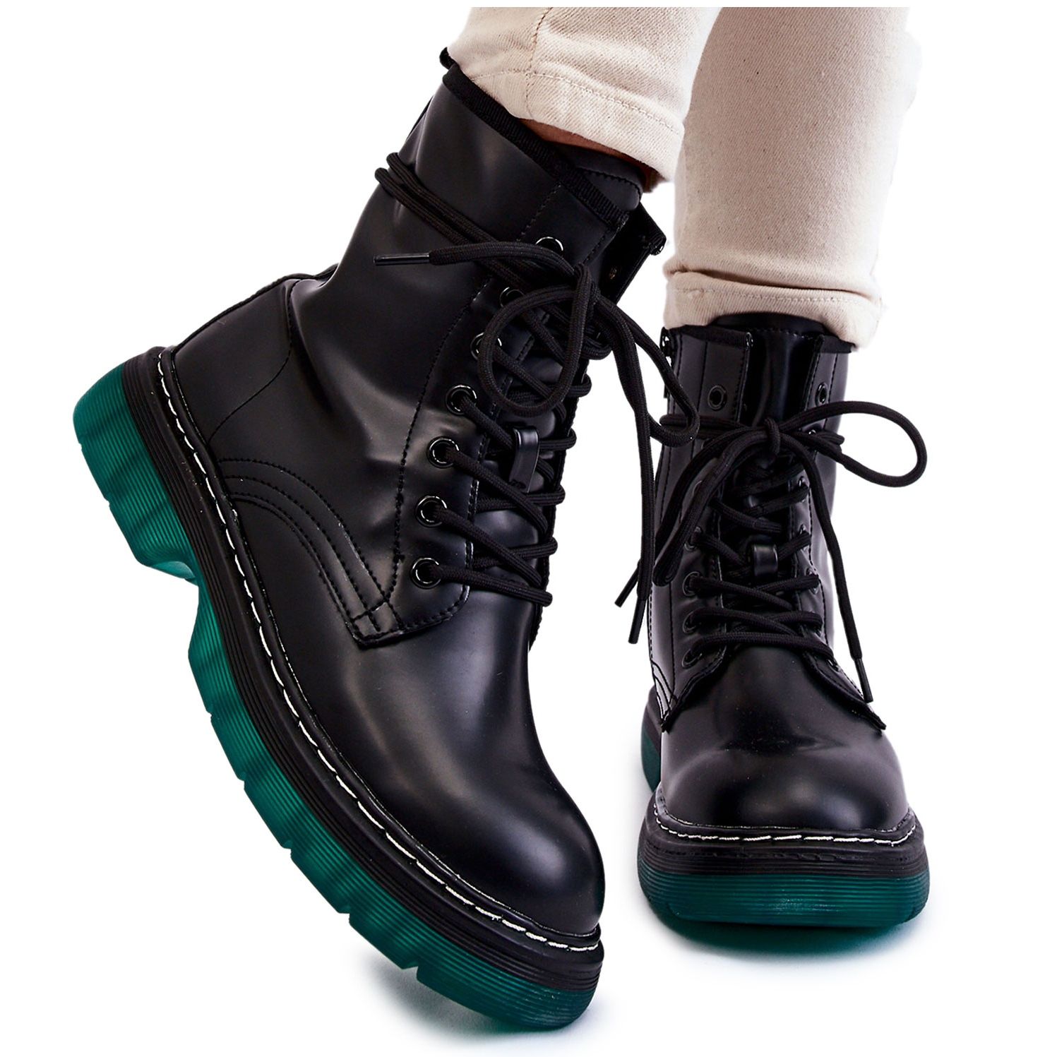 Klasické boty v moderním vydání - model Trinah kombinuje syrový, rockový charakter s pohodlím denně. Vyrobeno z plastu napodobujícího ekologickou pokožku, zabudovaný do plochého paty s plošinou (výška pata/platforma 4 cm). Charakteristická zelená podešev přidává zřetelný přízvuk a dokonale zdůrazňuje stylizace měst.