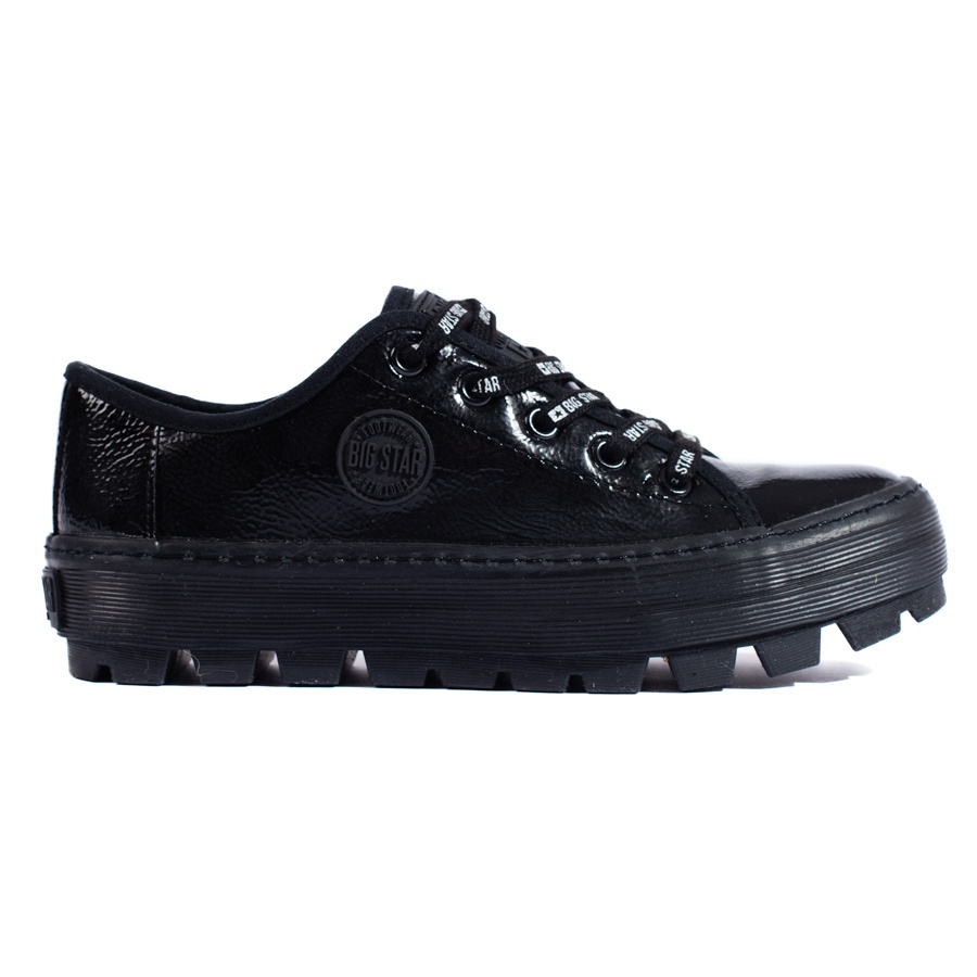 Lehký, stylový návrh z Big Star - Sneakers KK274044 vyrobený z lakované ekologické kůže v černé barvě. Je to kombinace sportovní postavy s městským stylem - ideální pro každodenní stylizace pro jaro a léto.