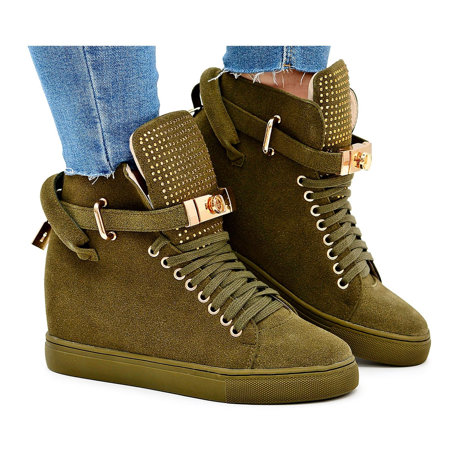 LU BOO Dámské tenisky Lu Boo semiš zlatý visací zámek olivový Elani zelená