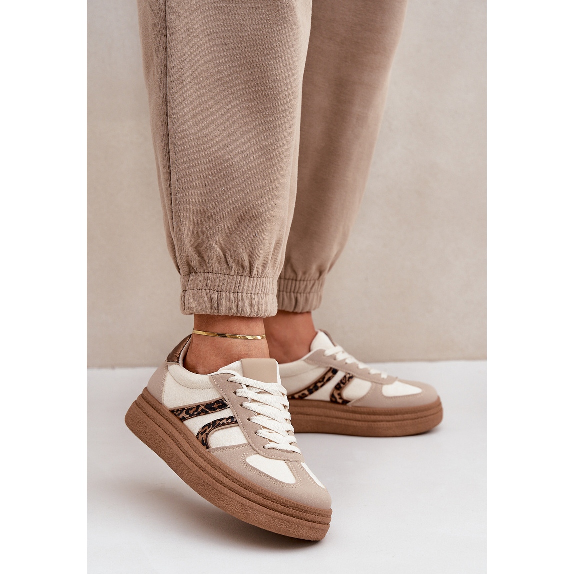 Tenisky jsou k dispozici v krásné béžové barvě s hnědými detaily, což je činí dokonale harmonizovat s mnoha barvami a vzory oblečení, včetně zvířecího trendu, který se v současné době vrací k módě. Model je vytvořen v typickém číslování, což usnadňuje výběr správné velikosti.