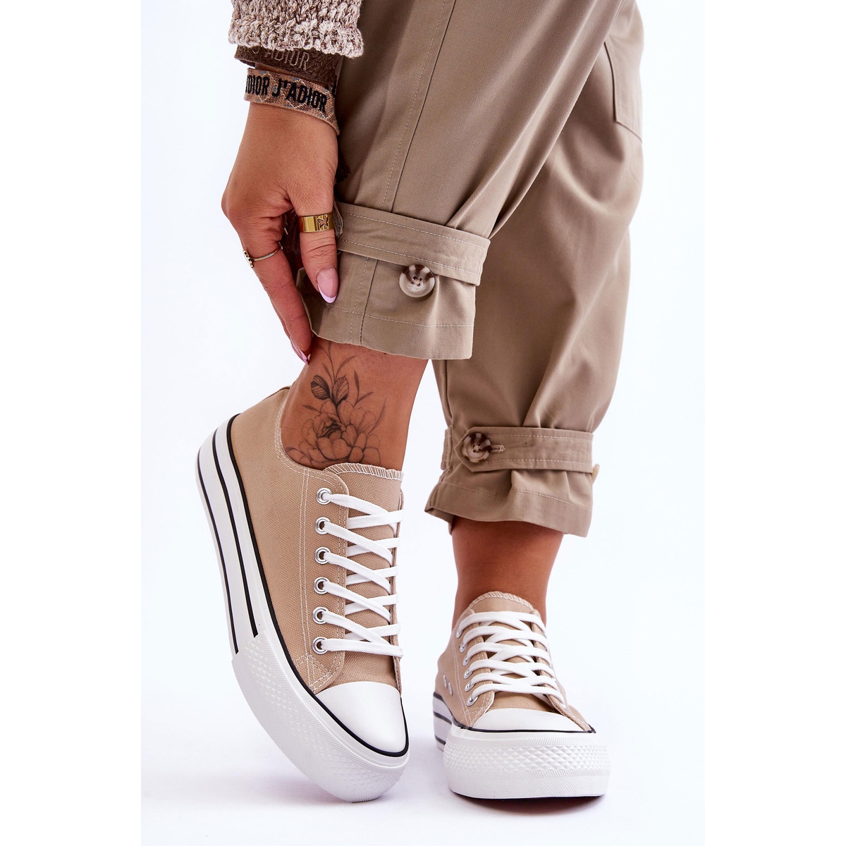 Horní výška 5,5 cm dodává charakter a kulatá špička dělá tenisky elegantní a lahodí oku. Jejich univerzální béžová barva se hodí k nejrůznějším kalhotám a sukním, což z nich dělá vynikající základ pro každodenní styling.