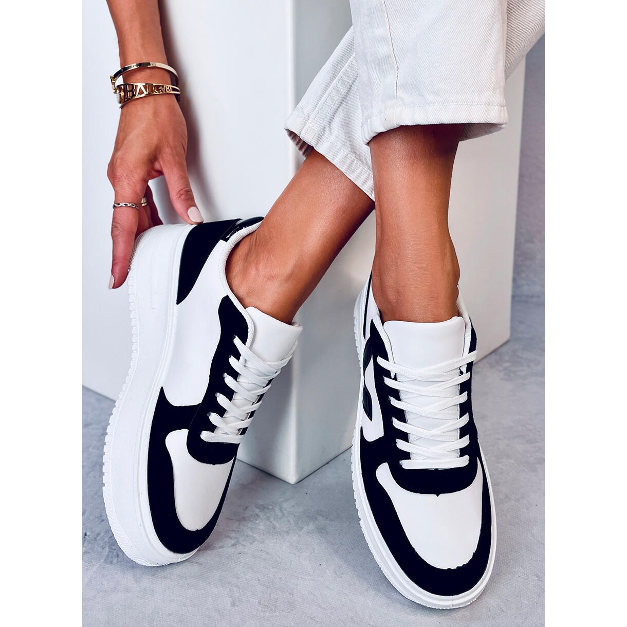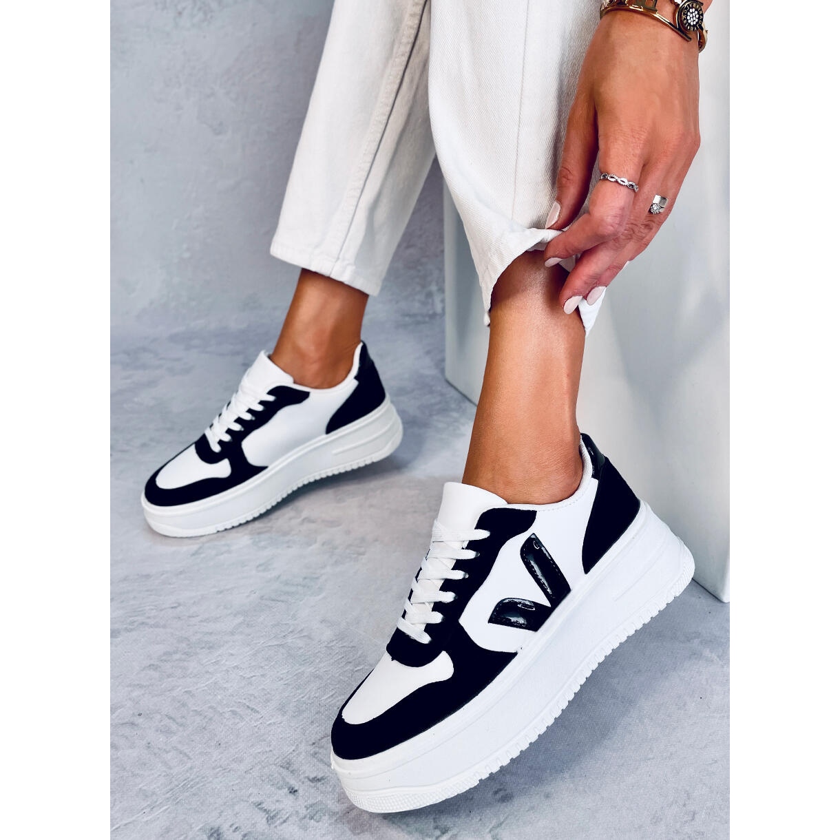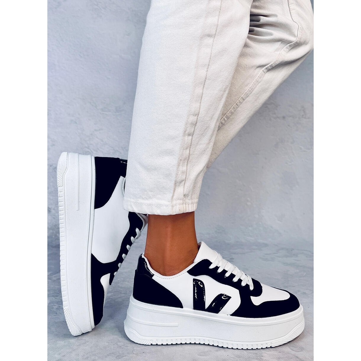 Tyto tenisky vyrobené z vysoce kvalitních materiálů mají vnější vrstvu z ekologické kůže a ekologického semiše, což zaručuje nejen estetický vzhled, ale i odolnost. Vnitřek bot je podšitý látkou, která zajišťuje pohodlí i při dlouhodobém nošení. Kulatá špička a plochá platforma zdůrazňují jejich moderní charakter a zapínání na šněrování umožňuje dokonalé přizpůsobení noze.