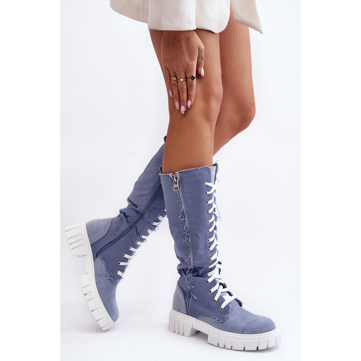 Představujeme Dámské zateplené džínové kozačky se šněrováním v barvě Cresanta Blue a béžové, které skvěle zapadnou do vašeho podzimně-zimního šatníku. Tyto stylové kozačky se svrškem sahajícím nad kolena jsou dokonalou kombinací pohodlí a módního designu.