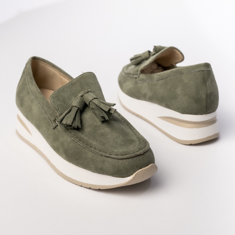 Objevte eleganci a pohodlí v jednom z nejmodernějších modelů pro sezónu - ženské mokasíny s třásněmi v atraktivní zelené barvě. Tyto stylové boty, vyrobené z měkkého semiše, určitě přitahují pozornost a věnují vaše každodenní a elegantní stylizace jedinečnému charakteru.