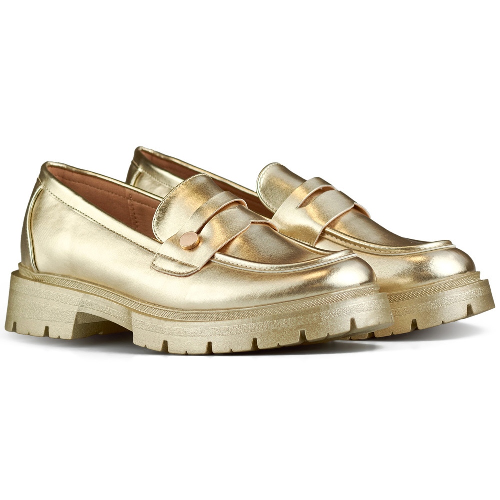 Tyto jedinečné boty se vyznačují kovovou zlatou barvou, která jistě zaujme oko a přidá ke každému stvoření nádheru. Kulatý nos poskytuje pohodlí nošení a vložená spona usnadňuje oblékání a odstranění. Platforma s vysokou 3,5 cm poskytuje další chuť a poskytuje dostatečné odpružení nohou.