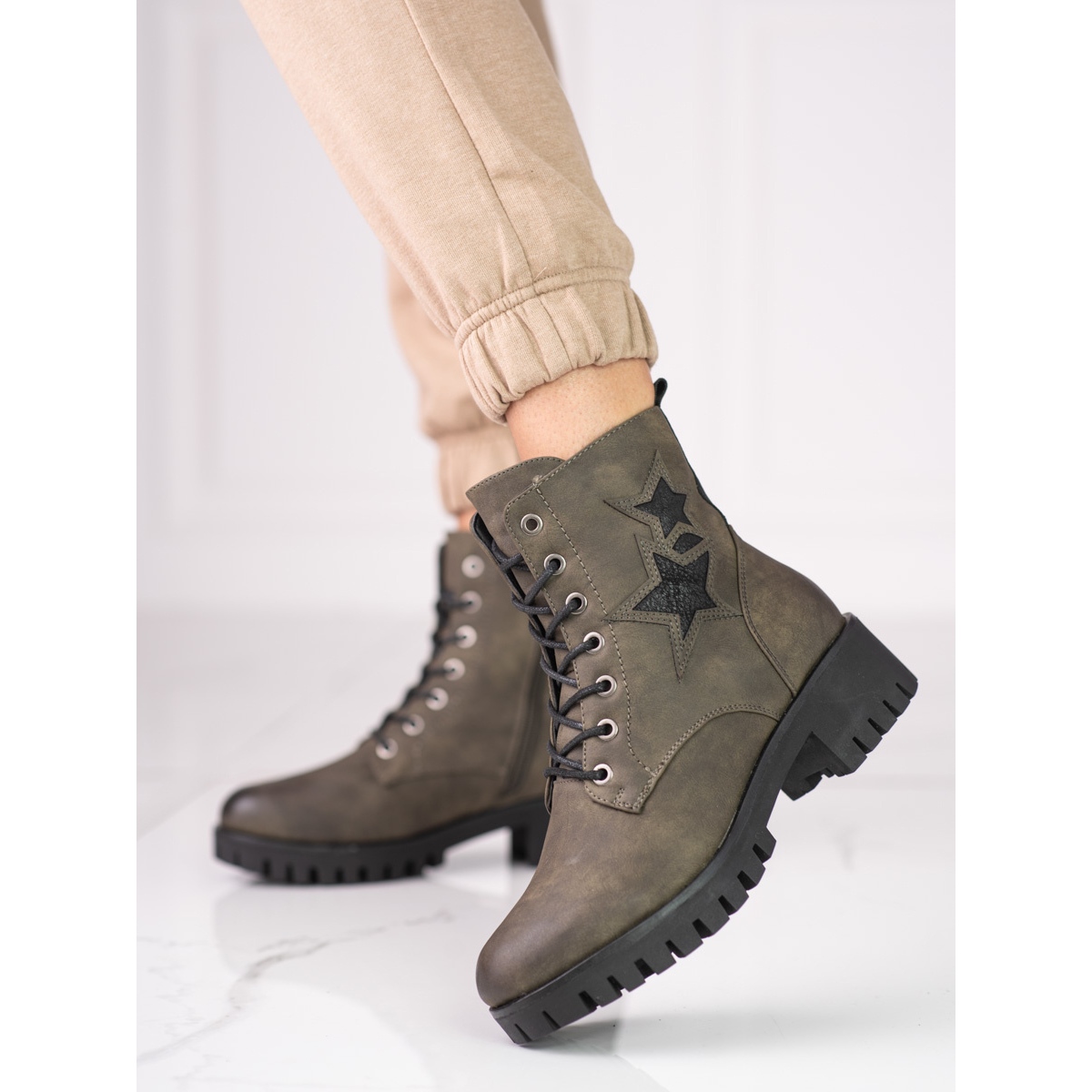 Pracovníky Shelovet se snadno nazouvají díky použití praktických zipů kombinovaných se šněrováním, což umožňuje dokonalé přizpůsobení obuvi individuálním potřebám. Šířka svršku je pohodlných 22 cm a výška kotníku dělá z těchto bot perfektní volbu ke kalhotám, šatům i sukni a vytváří tak vícerozměrné kombinace.