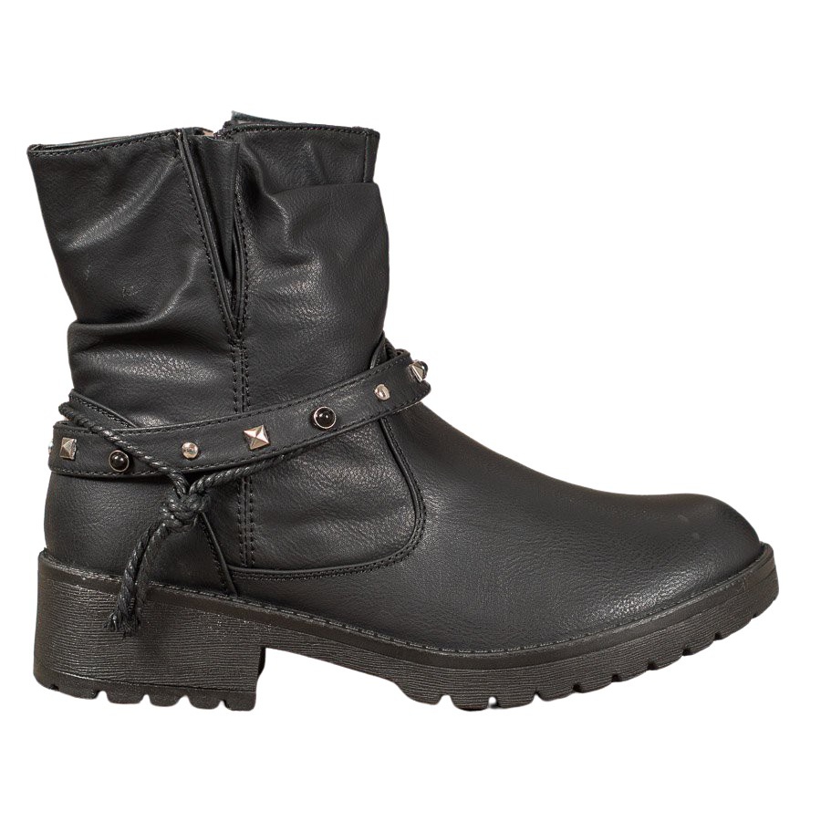 Dělnice vyrobené z ekologické kůže se vyznačují pevnou konstrukcí. Jejich estetická úprava a ozdobný pásek zdobený kamínky a korálky tyto boty odlišují od ostatních modelů. Díky plochému 4 cm vysokému podpatku a 2 cm platformě jsou boty nejen módní, ale také pohodlné. Zip umožňuje rychlé nazouvání a vyzouvání a vysoký svršek sahající nad kotník ještě podtrhuje jejich rockový charakter.
