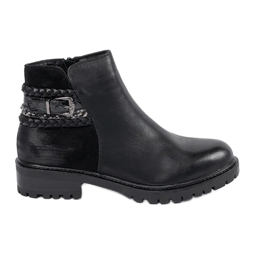 Svršek modelu sahá nad kotník a díky zipu se snadno obléká. Ozdobné pásky s ozdobnou přezkou jim dodávají rockový charakter a forma zajišťuje stabilitu díky širokému 4 cm vysokému podpatku a podrážce s chráničem zaručujícím přilnavost.