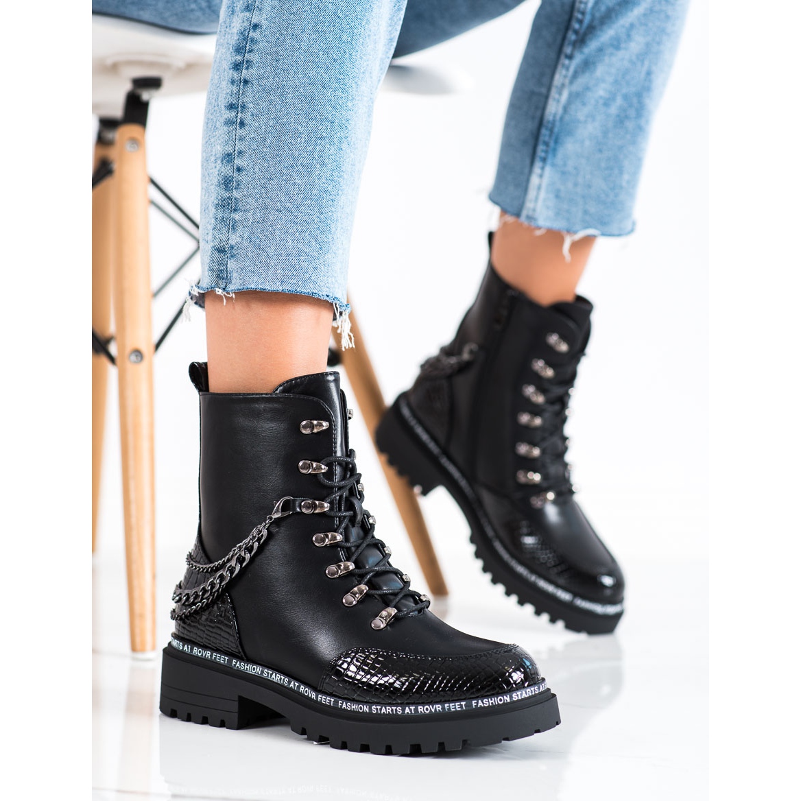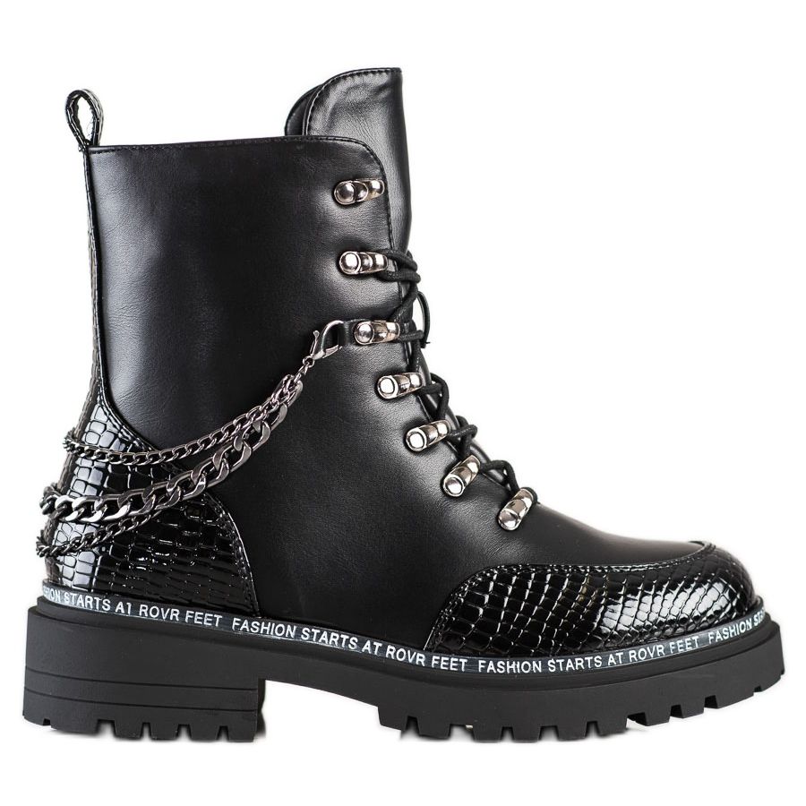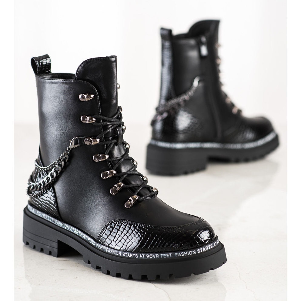 Vyrobeny z vysoce kvalitní ekologické kůže, vyznačují se pevným a stylovým vzhledem. Ozdobný řetízek jim dodává jedinečný akcent, který upoutá pozornost. Pracovníci mají zip a šněrování, což zajišťuje dokonalé přizpůsobení noze. Vestavěná vyztužená pata navíc zvyšuje komfort nošení a zateplení udrží nohy v teple i v chladných dnech.