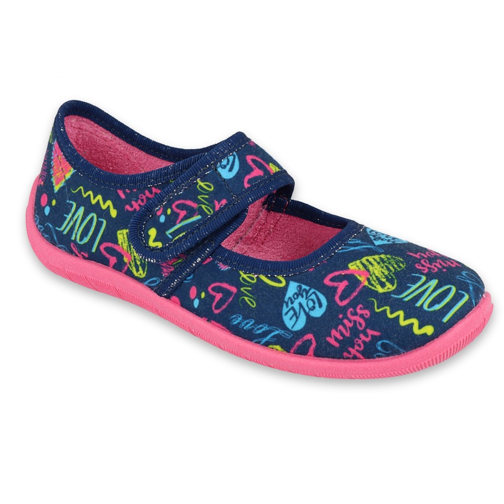 Barvy v odstínech námořnické modré a růžové dodávají veselý akcent každodennímu stylingu a moderní design dělá z pantoflí Befado perfektní doplněk do každého dětského šatníku.