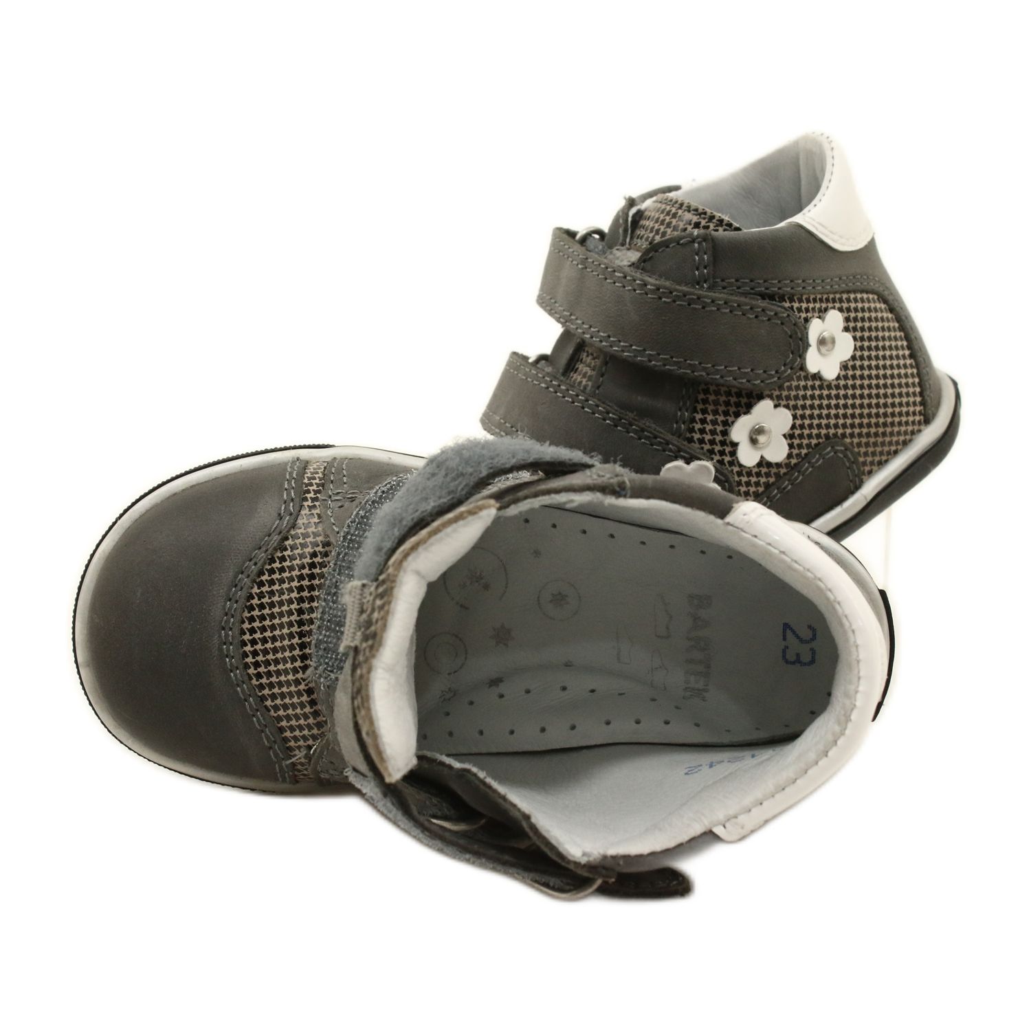 Elegantní a pohodlné boty polské značky Bartek, model 91904-1FN, v univerzální šedé barvě s jemnými bílými květy. Navrženo s ohledem na správný vývoj dětských nožiček - kombinace přírodních materiálů, promyšlená konstrukce a estetické provedení.