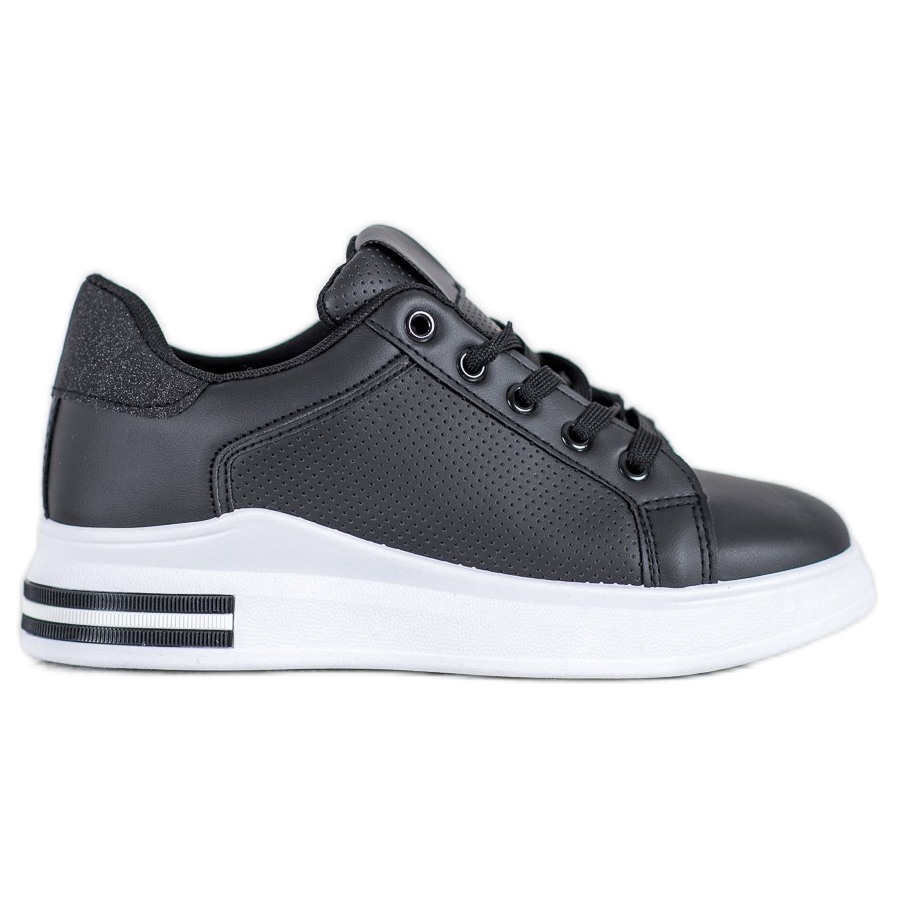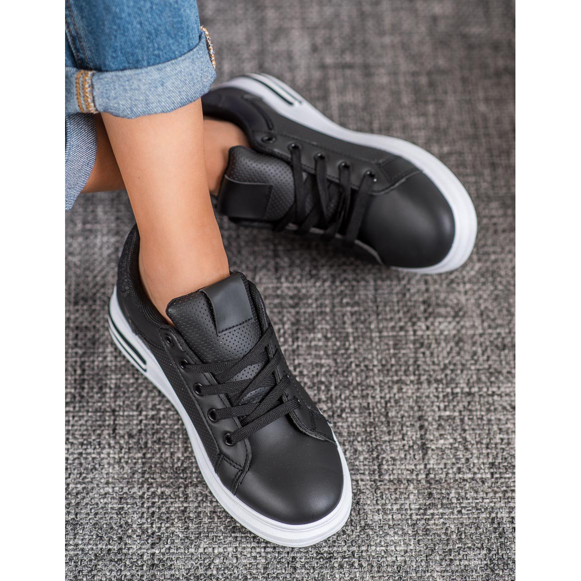 Tyto tenisky dostupné v klasické černé barvě mají zabudovaný měkký podpatek a kulatou špičku, která zaručuje pohodlí po celý den. Zapínání na tkaničky umožňuje dokonalé přizpůsobení noze a textilní vnitřek zajišťuje dostatečnou ventilaci.