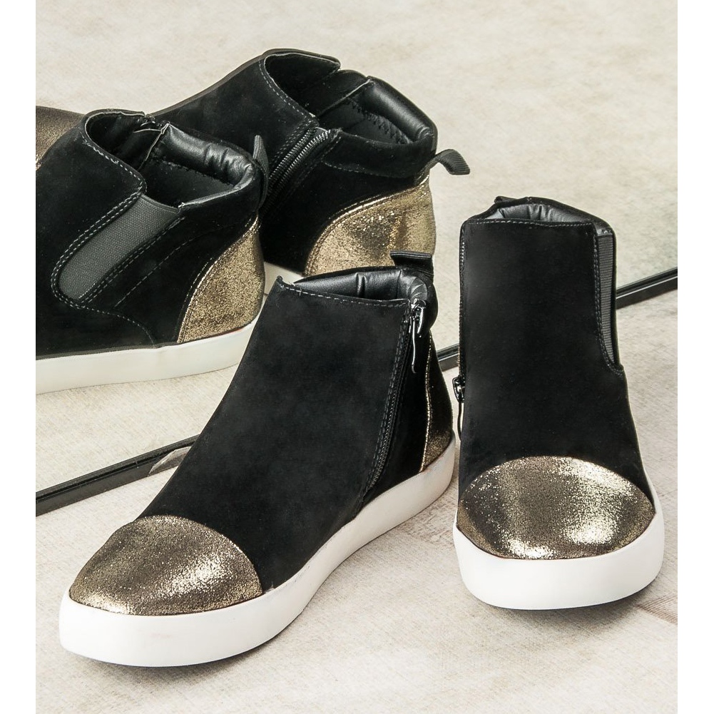 Představujeme elegantní dámské tenisky J. Star, které dokonale spojují styl s pohodlím. Tyto černé boty z ekologického semiše mají jedinečný vzhled díky lesklým zlatým povrchům na zaoblené špičce a patě. Tenisky se zapínají na praktický zip, svršek sahá pod kotníky, díky čemuž perfektně padnou na nohu.