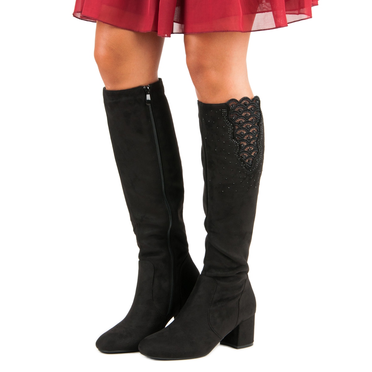 Černé kozačky se vyznačují krásně zdobeným svrškem, který upoutá pozornost decentní krajkou v horní části doplněnou o jemné krystaly. Tento detail jim dodává jedinečné kouzlo a sofistikovanost, díky čemuž jsou ideální volbou pro zvláštní příležitosti pro ženy, které oceňují dobrý vkus a módní styl.