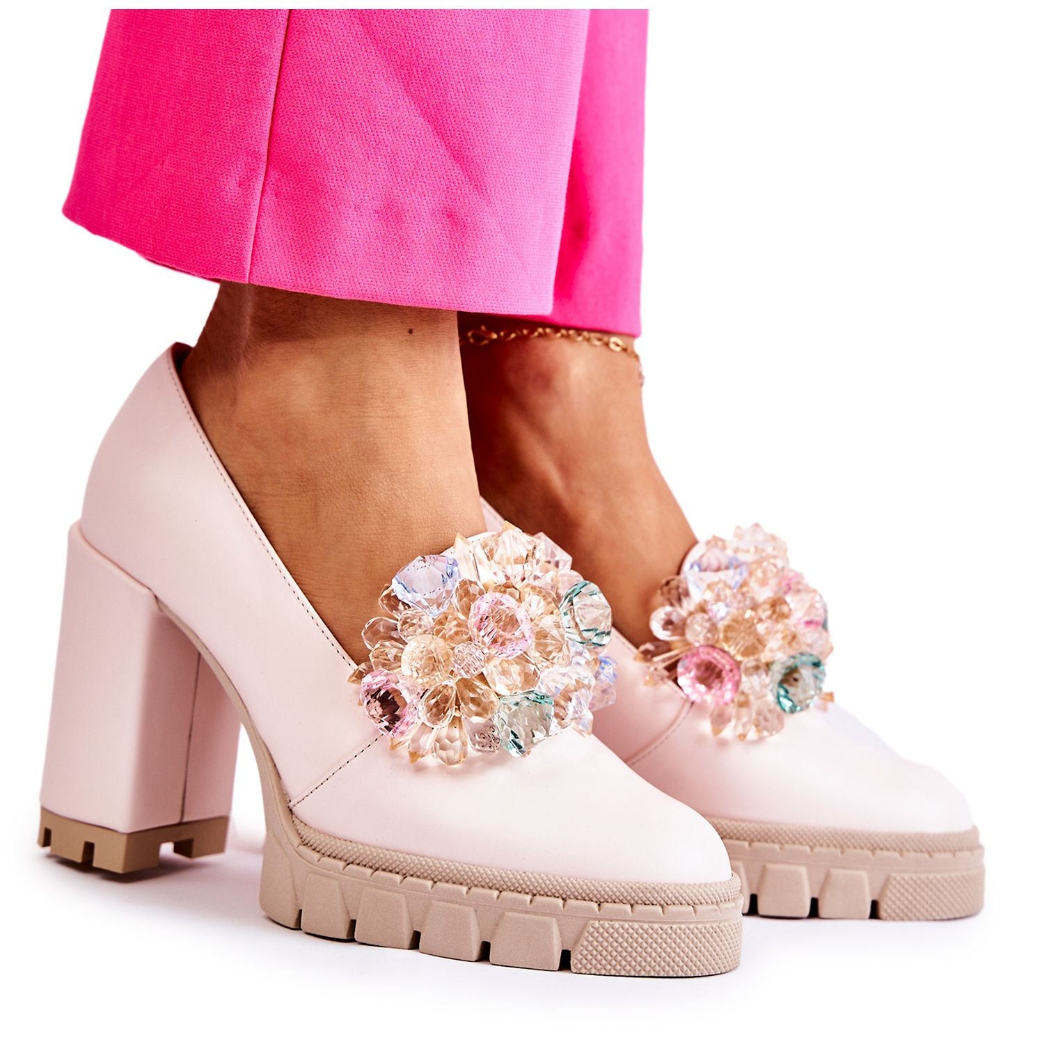 Představujeme unikátní model lodiček značky PA2 - Elegant Pumps With Decoration v jemném světle růžovém odstínu. Tyto stylové boty s masivním blokovým podpatkem a platformou jsou perfektní volbou pro různé příležitosti, od každodenních schůzek až po formálnější události.