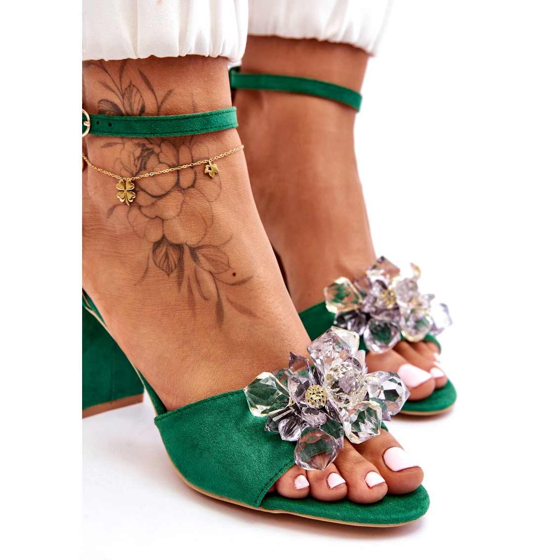 Co je zvláště pozoruhodné, jsou detaily, které odlišují tento model od ostatních. Pásek na přední straně sandálů zdobený módními krystaly dodává lesk a zdůrazňuje jedinečnost příležitosti. Nejen, že dotvářejí váš styl, ale také přispívají ke svůdné, ale sofistikované image.