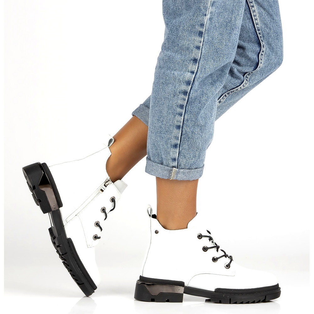 Stylové, lakované boty Filippo DBT4173 v klasické bílé barvě kombinují elegantní vzhled s pečlivým povrchem. Vyrobeno z přirozené lakované kůže, izolované příjemnou, krátkou kožešinou uvnitř, poskytují teplo a pohodlí během chladnějších dnů. Plochý paty s výškou 3,5 cm a zaoblenou nos zaručují stabilitu a pohodlí nošení po celý den. Zipper a šněrovací upevňovací prvek usnadňuje přizpůsobení horní části a jemné logo na boku přidává styl.