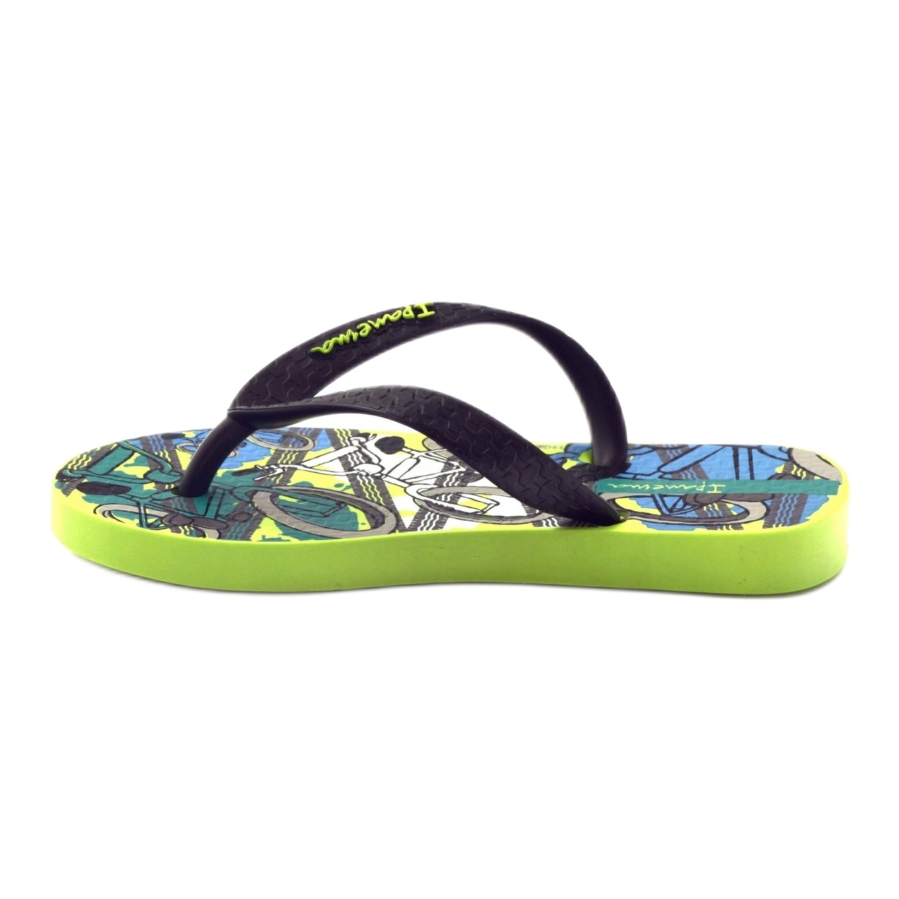 Žabky Ipanema 81713 se vyznačují elegantní černou barvou, která v kombinaci s jasně zelenou podrážkou vytváří originální a moderní design. Vnitřní část bot zdobí zajímavý cyklistický motiv, který jim dodává mladistvý charakter. Tyto žabky jsou nejen funkční, ale také stylové, ideální pro chlapce i dívky. Díky pevným, tlustým popruhům, které pevně drží nohu, mohou děti volně běhat a skákat.