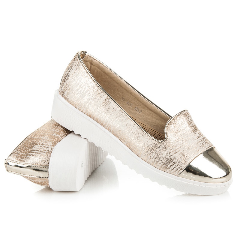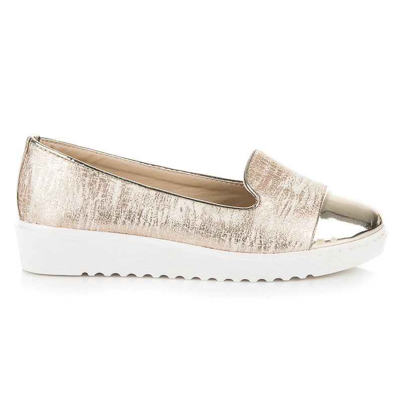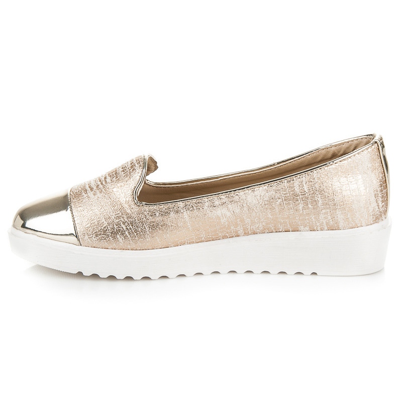 Jejich zlatá barva jim dodává jedinečný charakter a skvěle doplní každodenní i večerní styl. Navíc kulatá špička a 3 cm vysoká platforma zaručují komfort nošení po celý den. Díky nazouvacímu uzávěru je nazouvání a vyzouvání extrémně snadné.