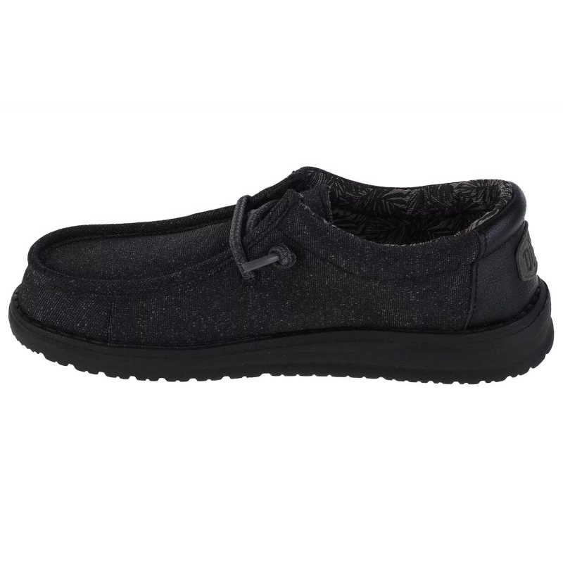 Klasické a univerzální hey Dude Wally mládí základní boty pro děti. Lace -Up model perfektní každý den - funguje to jak pro školní skříň, tak pro hru venku. Horní vyrobená z textilních/syntetických materiálů a textilní podšívky zajišťují pohodlí nošení a nadčasové černé barvy odpovídají každé stylizaci.