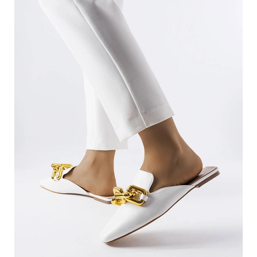 Bílé překlopení s řetězem Hickory - stylové mezky pro každou letní příležitost. Sklouzl, postavil vpředu, se čtvercovým, štíhlým nosem a mírně nepravidelným okrajem horního. Zdobené tlustým zlatým řetězem, vyrobeným z vysoce kvalitní ekologické kůže - módní přízvuk, který se objeví jak každodenní i elegantnější stylizaci.