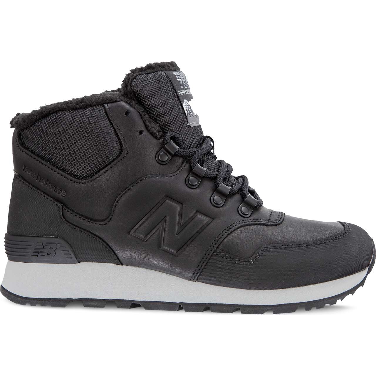 New Balance HL755MLA Black - zateplené, vysoké outdoorové boty určené do chladnějších měsíců. Černý kožený svršek kombinuje klasický vzhled s odolností a polstrovaný límec s měkkou kožešinou zajišťuje teplo a pohodlí i při nízkých teplotách. Charakteristické logo „N“ na bocích zdůrazňuje sportovní charakter a známost značky.