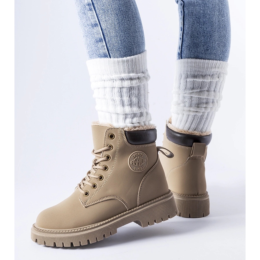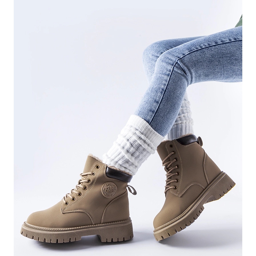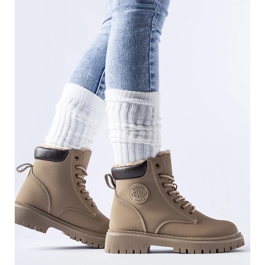 Hnědé zateplené boty jsou dámské boty, řazené mezi kotníkové boty, tyto boty jsou vzorovaným doplňkem každého zimního stylingu. Jsou vyrobeny z khaki ekologické kůže a mají také hnědou gumovou podrážku, která poskytuje vynikající přilnavost na kluzkém povrchu.