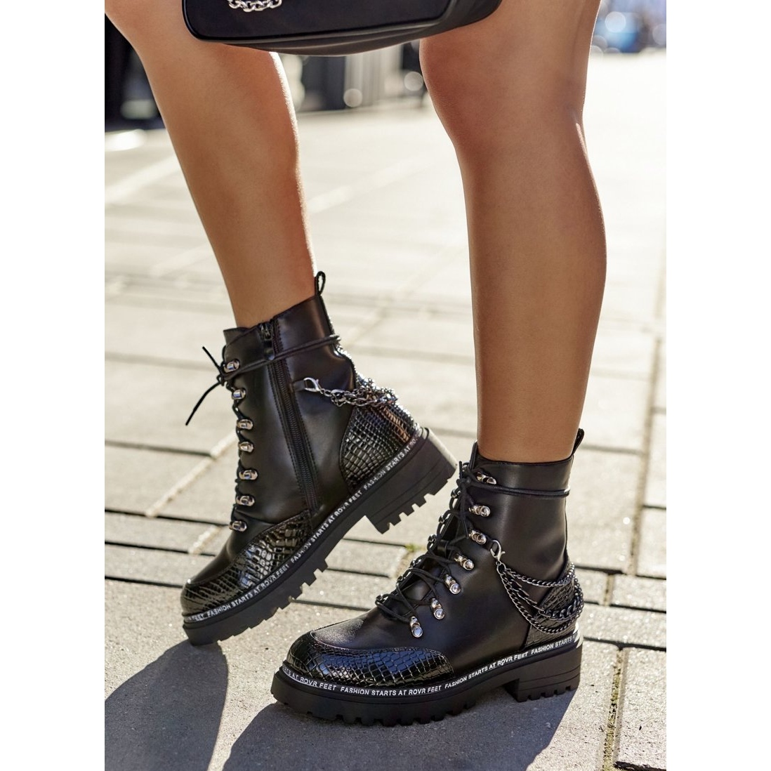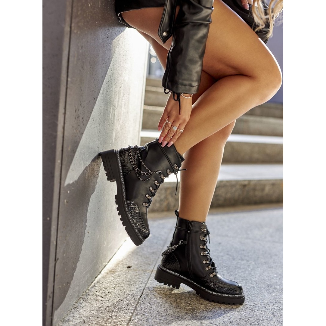 Stylové, praktické ženské pracovníky vyrobené z ekologické kůže, která kombinuje syrový městský vzhled s pohodlím. Interiér izolovaný přikrývkou z měkké obuvi poskytuje pohodlí a teplo v chladnějších dnech. Zdobené kovovými řetězci pro módní přízvuk, vybavené současně šněrováním a pohodlným bočním zámkem - snadno se nasadí a upravte se, pokud jde o přizpůsobení.