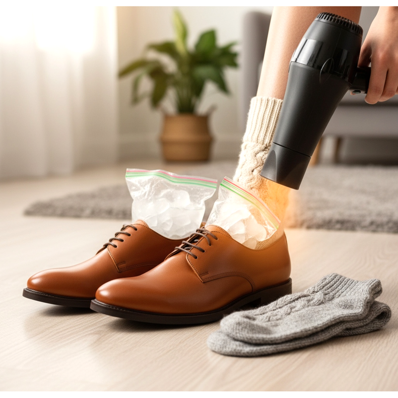 Originální, ale účinné: dva těsné sáčky na zip naplňte vodou, vložte je dovnitř bot tak, aby vyplnily celý vnitřek, a poté dejte boty přes noc do mrazáku. Voda zamrzne a roztáhne se a natáhne materiál zevnitř. Po vyjmutí počkejte, až led začne tát a teprve poté sáčky vyjměte. Tato metoda funguje obzvláště dobře u kožených bot.