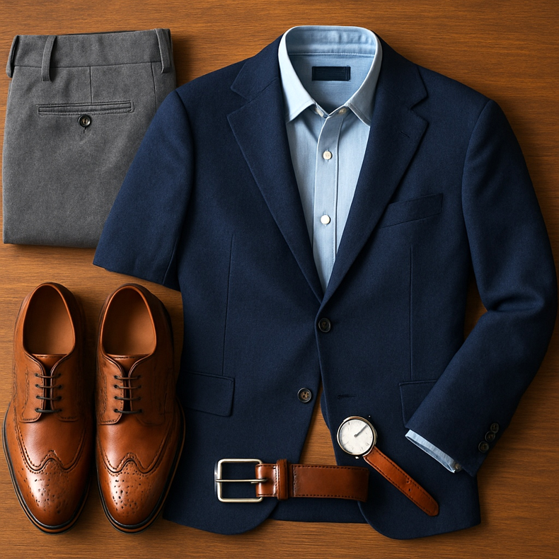 Oblek (bez kravaty OK) + košile + hnědé/černé oxfordky. Minimalistické hodinky.