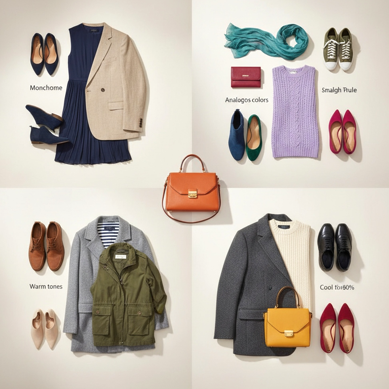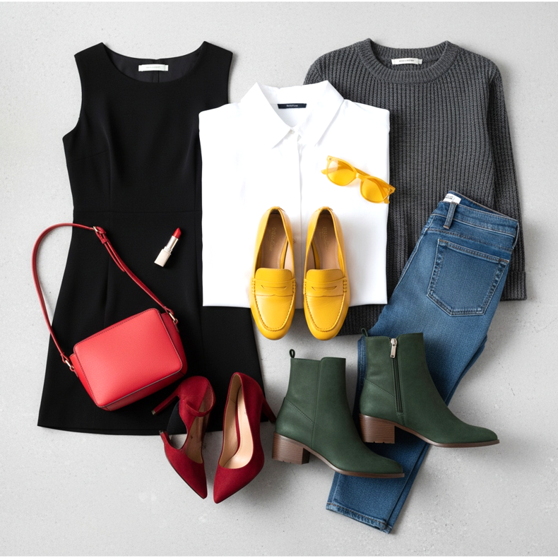 Pravidlo 60-30-10 vám pomůže vyvážit barvy ve vašem stylingu. 60 % oblečení by měla být dominantní barva (např. šaty), 30 % sekundární barva (např. kabelka, kabát) a 10 % akcentní barva (např. boty, šperky). Boty jako akcent mohou být výrazné, aniž by zahltily celek.
