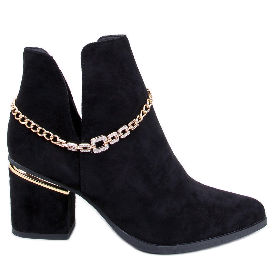 Černící se ekologický semiš zaujme kvalitou zpracování a decentní výřezy a atraktivní řetízek s lesklými kamínky jim dodávají jedinečný charakter. Díky zúžené špičce vypadá noha v těchto botách mimořádně půvabně a elegantně, což z nich dělá perfektní doplněk každodenního stylingu.