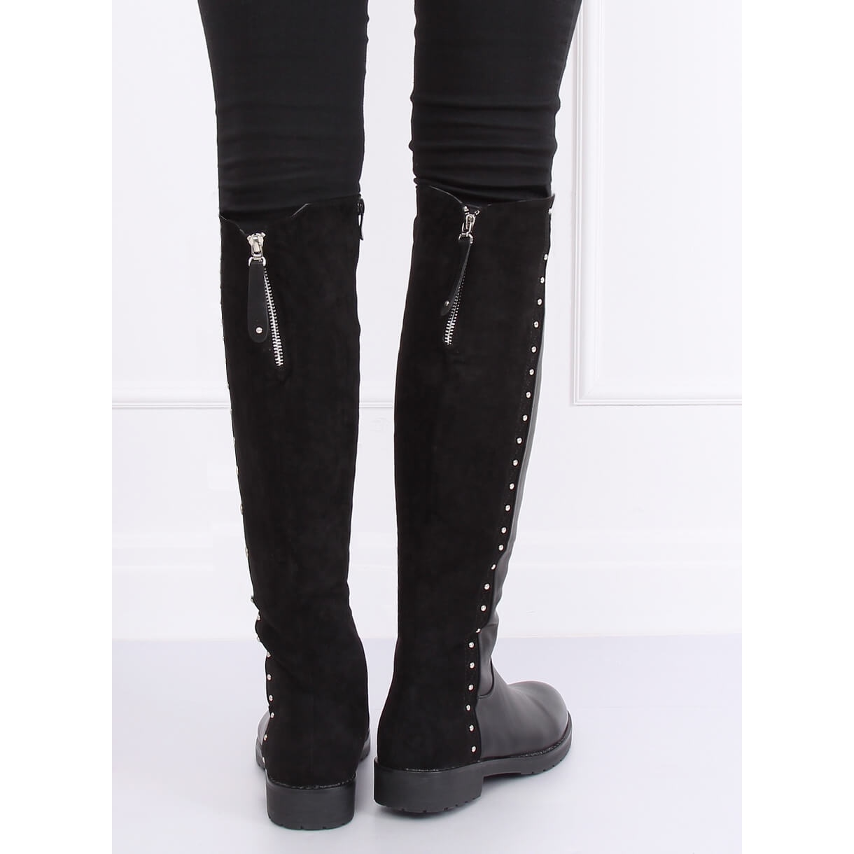 Díky klasické černé barvě se perfektně hodí k různým stylům – od ležérních až po elegantnější. Vysoký svršek sahající až ke kolenům, zdobený poutavými cvočky a kamínky, dodává botám výrazný charakter a nechává vyniknout v davu.