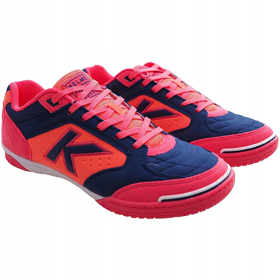 Kelme Precision Indoor 55211 9816 Vnitřní boty - barevná, stylová a funkční obuv vytvořená pro hraní v hale a sociálních zápasech. Model v intenzivních odstínech růžové, tmavě modré a oranžové upoutal oko a zároveň nabízí pohodlí a kontrolu nad míčem během dynamických akcí.